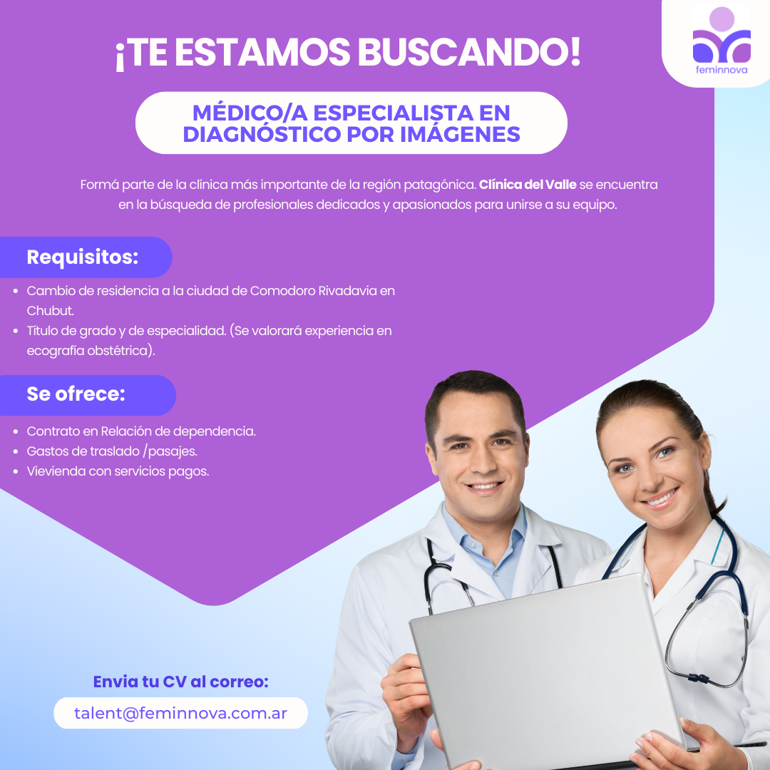 Mi nombre es Maira Langkilde, Headhunter de Feminnova. Nos ponemos en contacto con ustedes porque actualmente estamos llevando a cabo una búsqueda activa de Médicos/as Especialistas en Diagnóstico por Imágenes para la Clínica del Valle, ubicada en Comodoro Rivadavia, Chubut, y creemos que esta oportunidad podría ser de interés para los profesionales asociados a su institución.